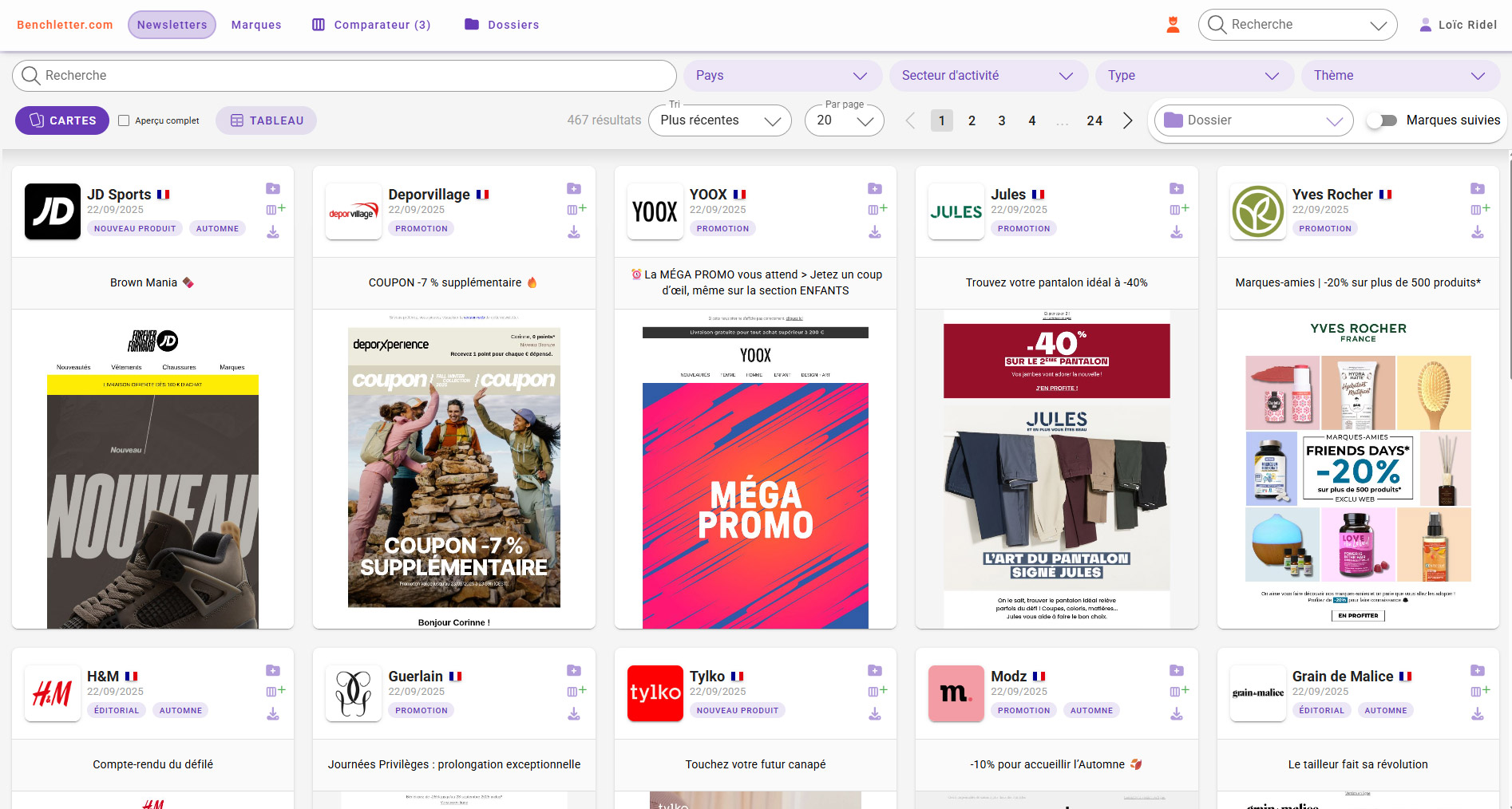 Benchletter collecte, classe et analyse des milliers de newsletters de marques. Vous suivez votre marché en un clin d'œil, repérez les tendances et trouvez l’inspiration pour vos prochaines campagnes.