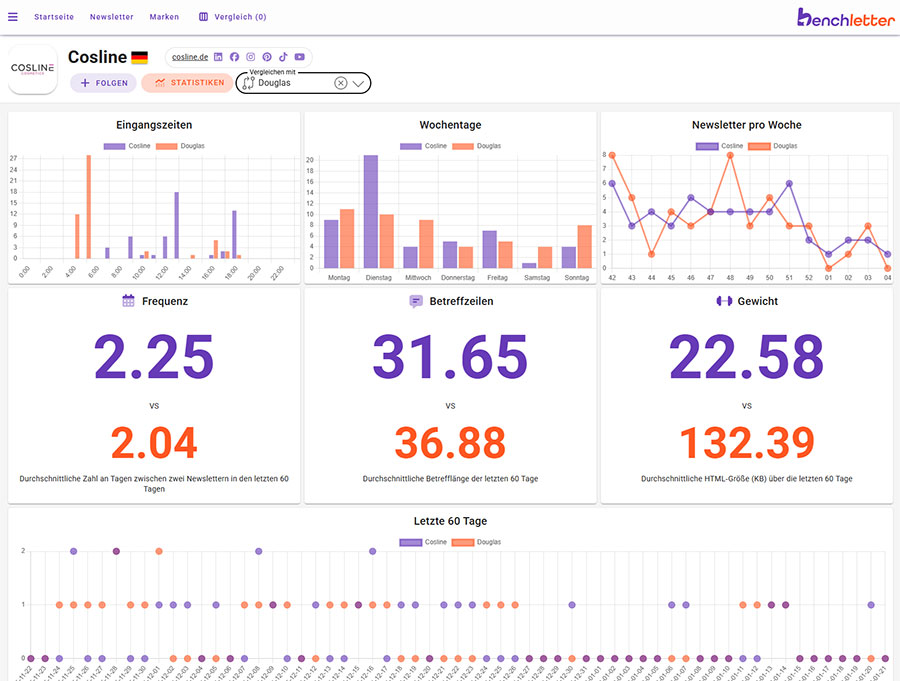 Deine Wettbewerber kommunizieren jede Woche. Benchletter zentralisiert ihre Newsletter, sortiert nach Marke und E-Commerce-Branche, und liefert umsetzbare Insights: Versandfrequenz, Tage & Uhrzeiten, Betreffzeilen, saisonale Themen, E-Mail-Typ (Editorial, Promotion, Welcome-Mail usw.).
