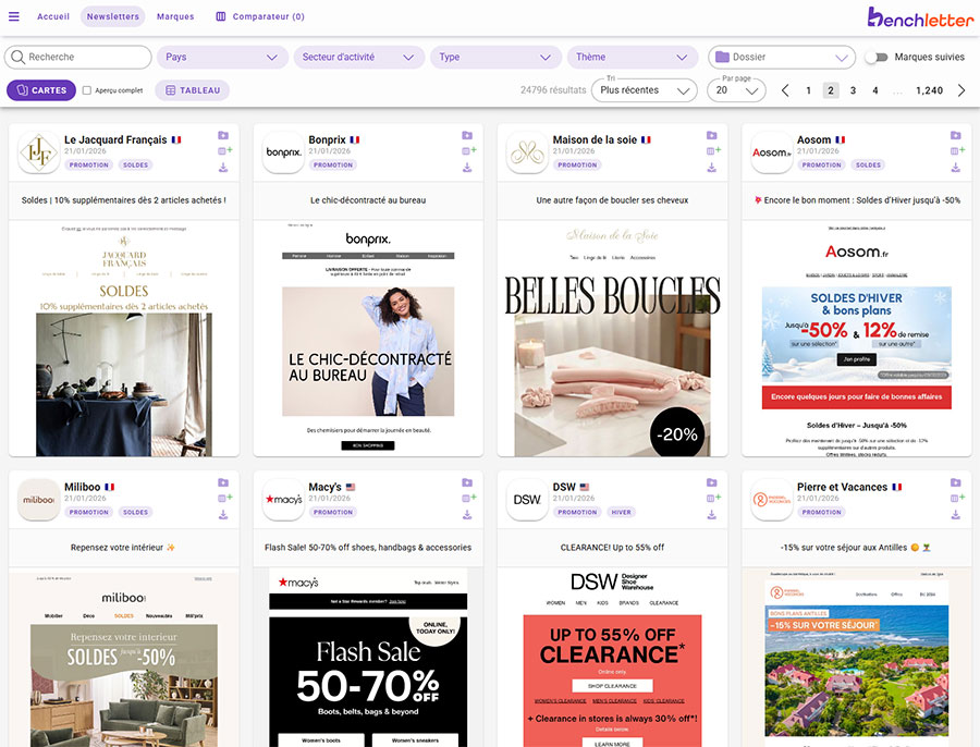 Benchletter collecte, classe et analyse des milliers de newsletters de marques. Vous suivez votre marché en un clin d'œil, repérez les tendances et trouvez l’inspiration pour vos prochaines campagnes.