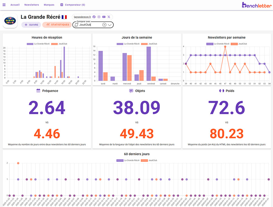 Benchletter fournit des indicateurs de contexte (fréquence, formats, tendances). Nous ne pouvons pas avoir accès aux performances d'ouverture de vos concurrents.